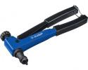 Заклепочник состоит из двух соединенных между собой рукояток и рабочей части, в которую вставляется наконечник под заклепку. В соединяемых элементах проделывается сквозное отверстие, куда помещается головка заклепки, а ее стержень – в наконечник инструмента. Рукоятки сжимаются, и под силовым воздействием крепежный элемент сплющивается, фиксируя элементы. По такому же принципу работает пневматический заклепочник, только вместо двух ручек в его конструкции предусмотрена рукоять куркового типа.